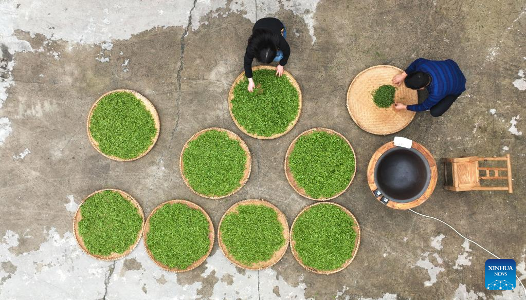 This aerial photo taken on March 20, 2023 shows tea makers stir-frying tea leaves in Tashan Town of Changning, central China's Hunan Province. Tea farmers in Tashan are busy picking and processing tea leaves in harvest season. The local economy is boosted as tea planting industry in Tashan is integrated with tourism. (Xinhua/Zhao Zhongzhi)