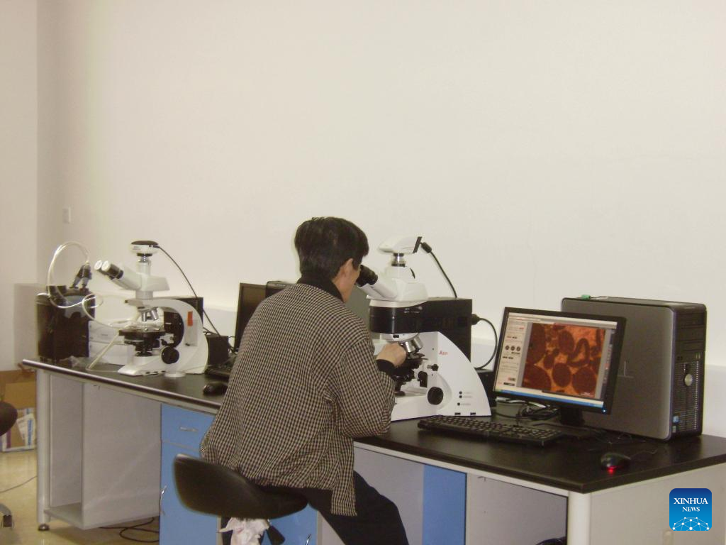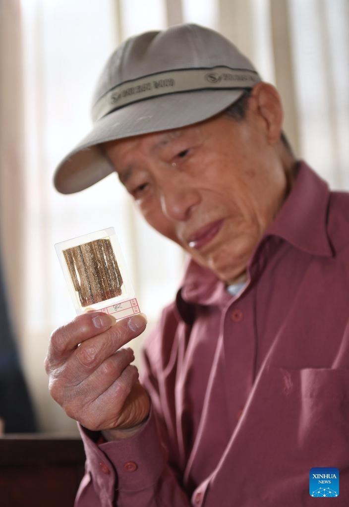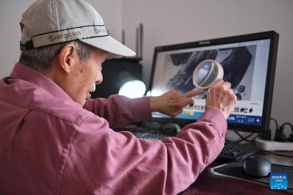 Wu Xichun observes a fossil fragment of Triassic siliceous sponge at home in Chengdu, southwest China's Sichuan Province, March 7, 2023. (Xinhua/Liu Kun)