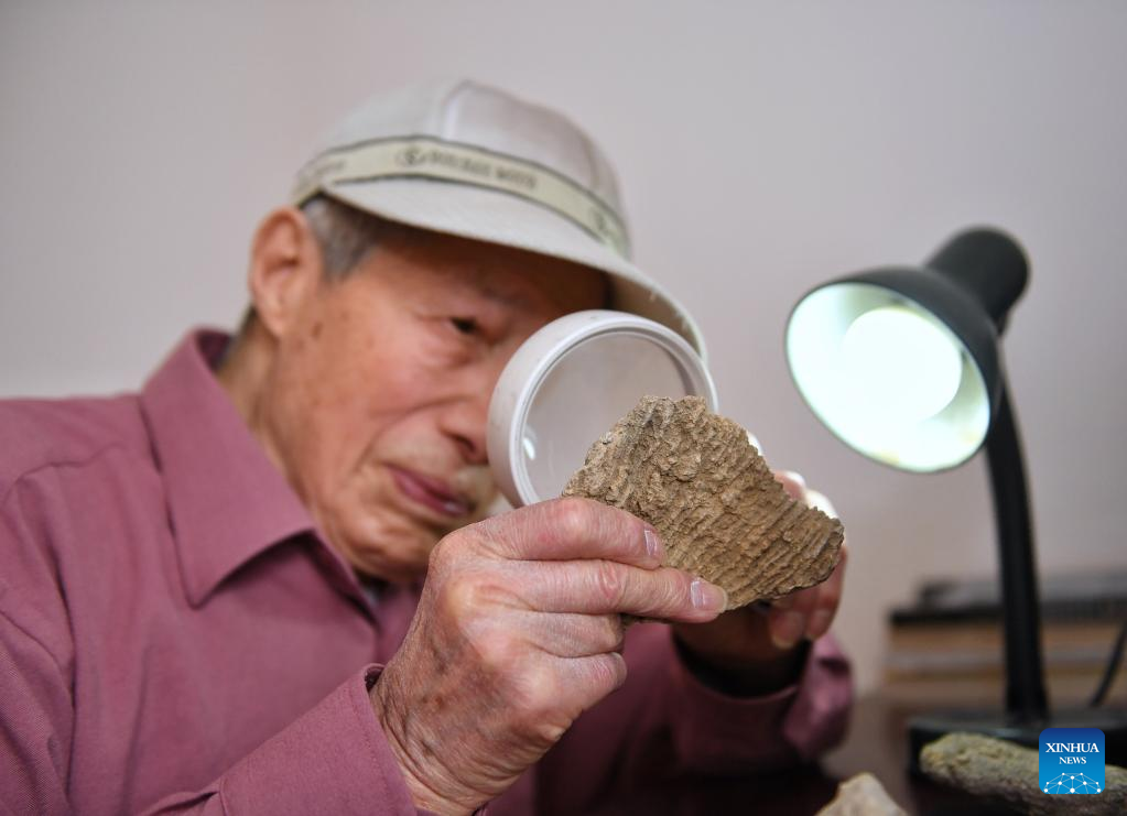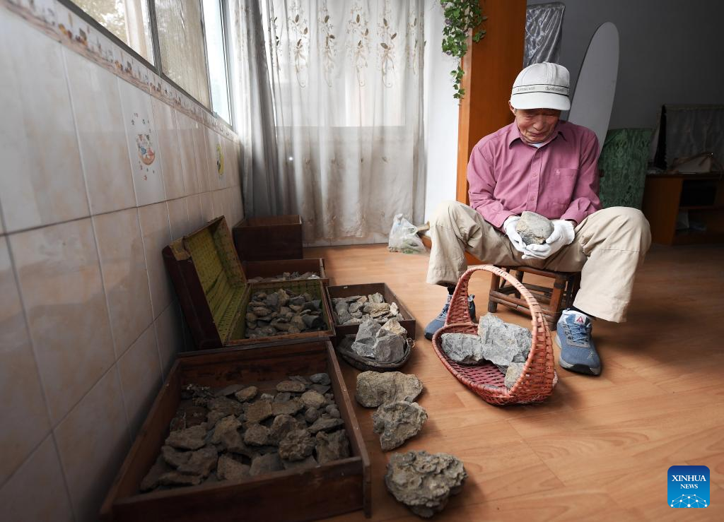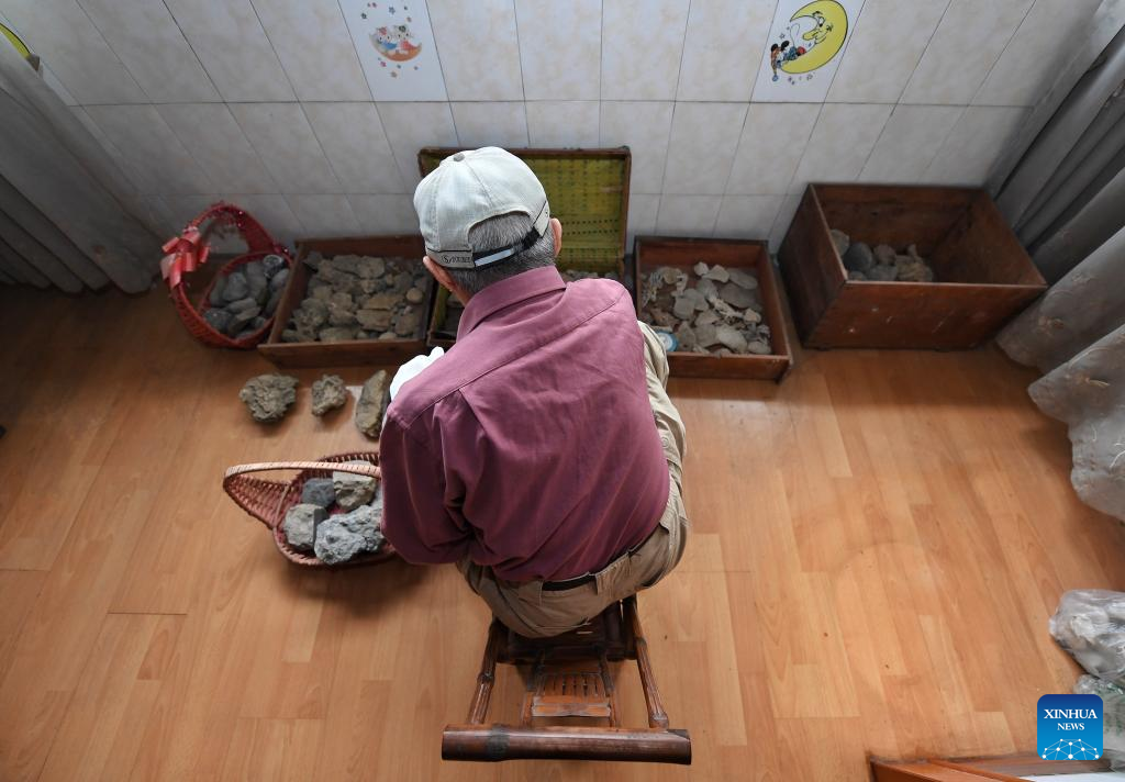 Wu Xichun arranges his fossil collection at home in Chengdu, southwest China's Sichuan Province, March 7, 2023. (Xinhua/Liu Kun)
