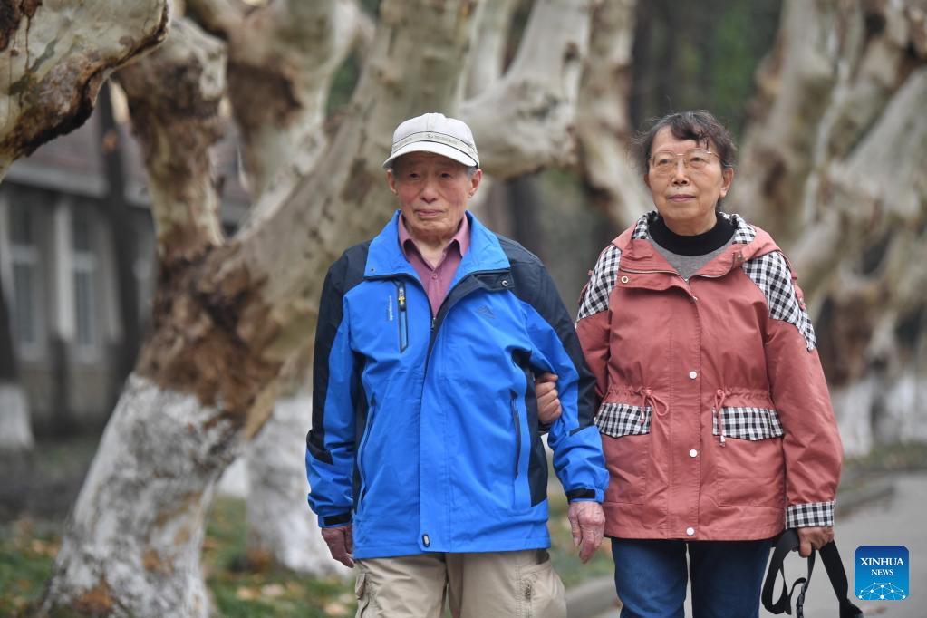 Wu Xichun (L) and his wife Li Peihua walks in the campus of Chengdu University of Technology in Chengdu, southwest China's Sichuan Province, Feb. 27, 2023. (Xinhua/Liu Kun)