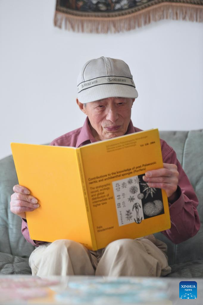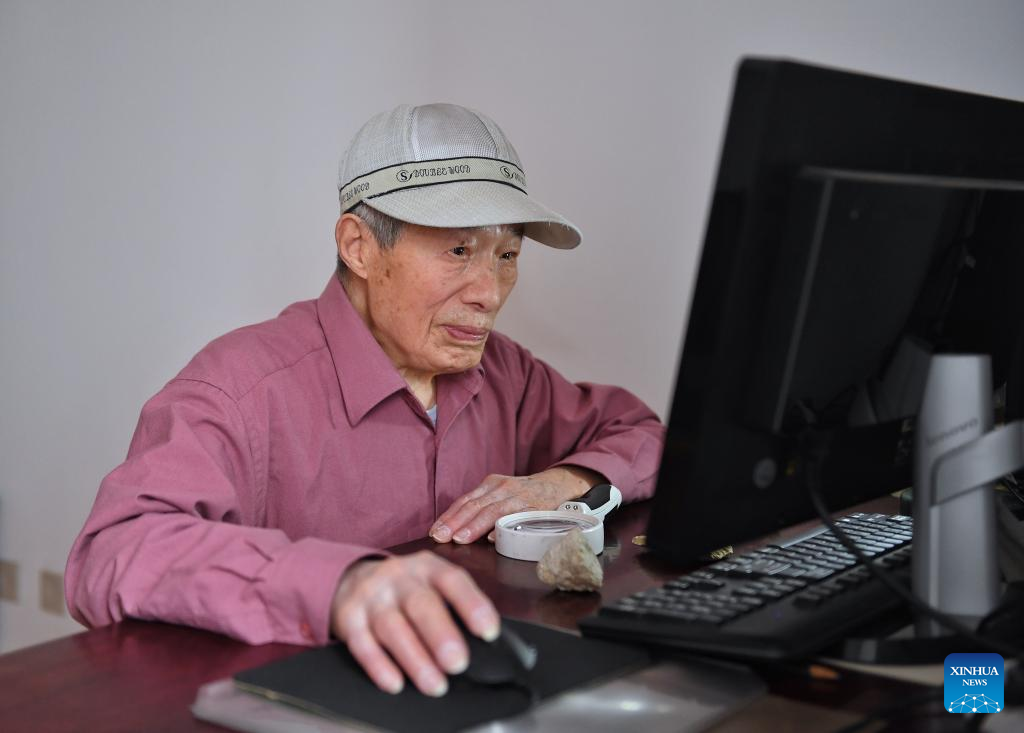Wu Xichun observes a photo of sponge fossil at home in Chengdu, southwest China's Sichuan Province, March 7, 2023. (Xinhua/Liu Kun)