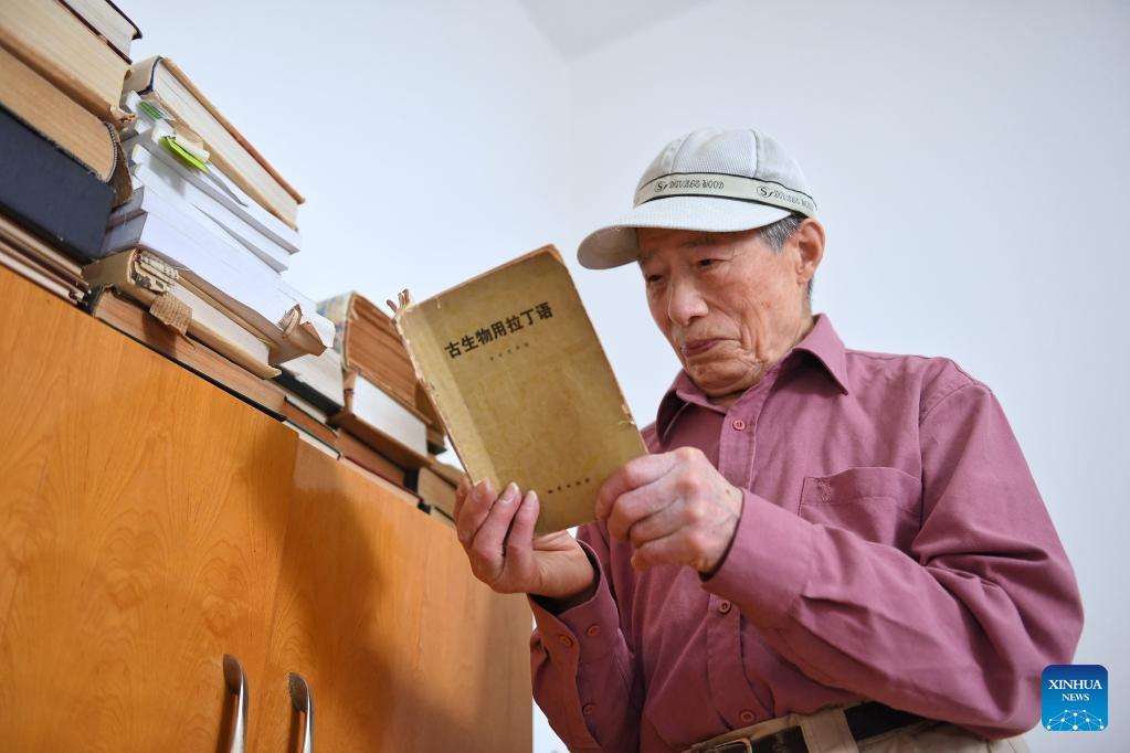 Wu Xichun looks through a book at home in Chengdu, southwest China's Sichuan Province, March 7, 2023. (Xinhua/Liu Kun)