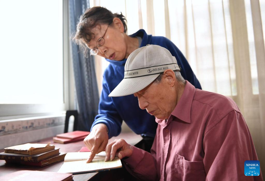 Wu Xichun arranges files with his wife Li Peihua at home in Chengdu, southwest China's Sichuan Province, March 7, 2023. (Xinhua/Liu Kun)