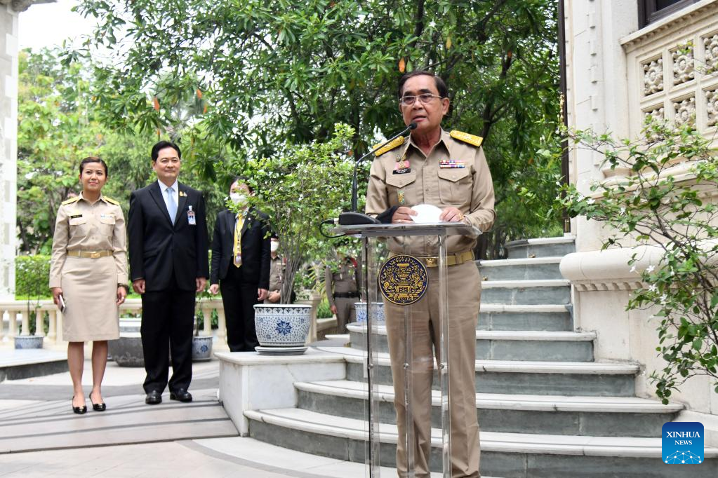 Thai Prime Minister Prayut Chan-o-cha (front) delivers a speech to media at the Government House in Bangkok, Thailand, March 20, 2023. Thailand announced on Monday that the House of Representatives has been dissolved, paving the way for a general election within two months, according to a royal decree. (Xinhua/Rachen Sageamsak)