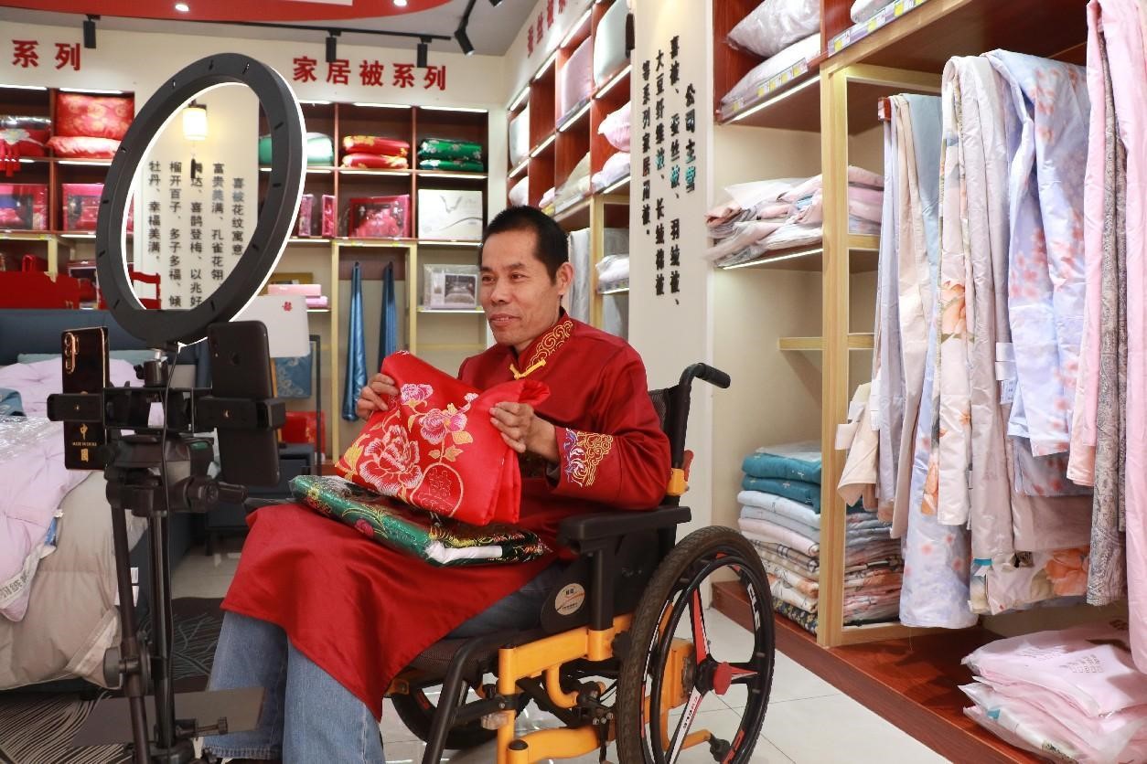 A man with mobility impairments sells products via livestreaming in Pangjia township, Binzhou, east China's Shandong province. (People's Daily Online/Shao Qiang)