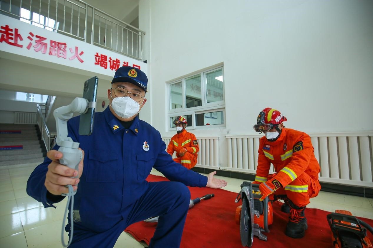 Firefighters in Hutubi county, Changji Hui autonomous prefecture, northwest China's Xinjiang Uygur autonomous region, share fire safety tips via livestreaming. (People's Daily Online/Tao Weiming)