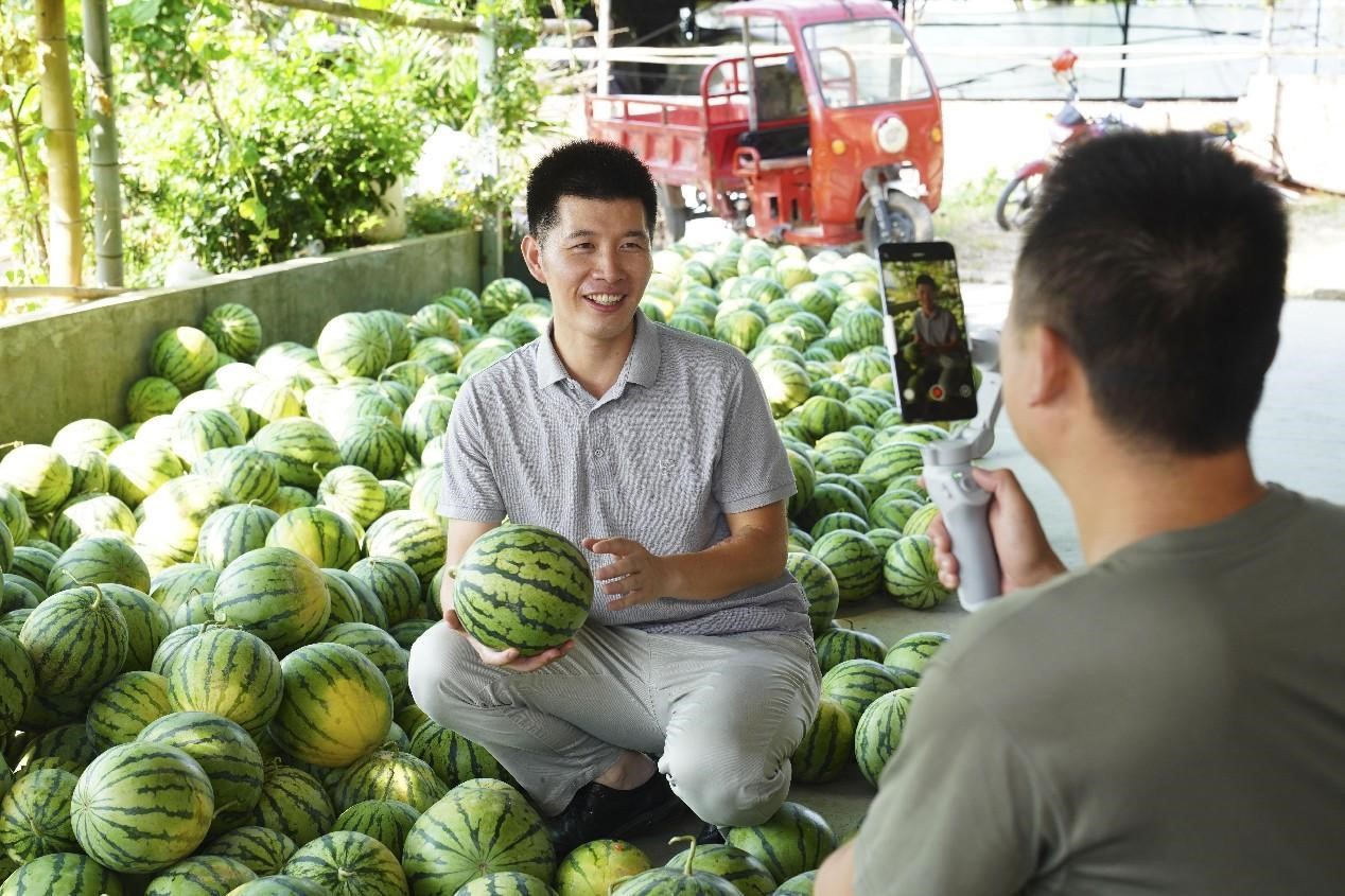 A farmer sells watermelons on a short video platform in Xishanping village, Beibei district, southwest China's Chongqing municipality. (People's Daily Online/Qin Tingfu)