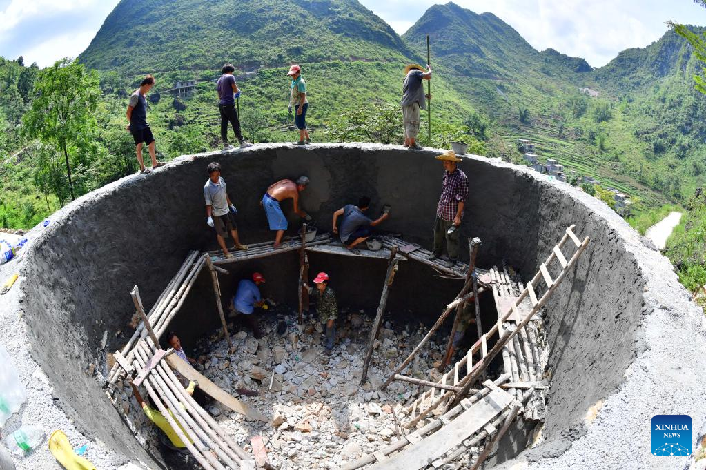 This photo taken on Sept. 2, 2017 shows villagers building a household water tank in Nongyong Village of Bansheng Township, Dahua Yao Autonomous County, south China's Guangxi Zhuang Autonomous Region. (Xinhua/Huang Xiaobang)