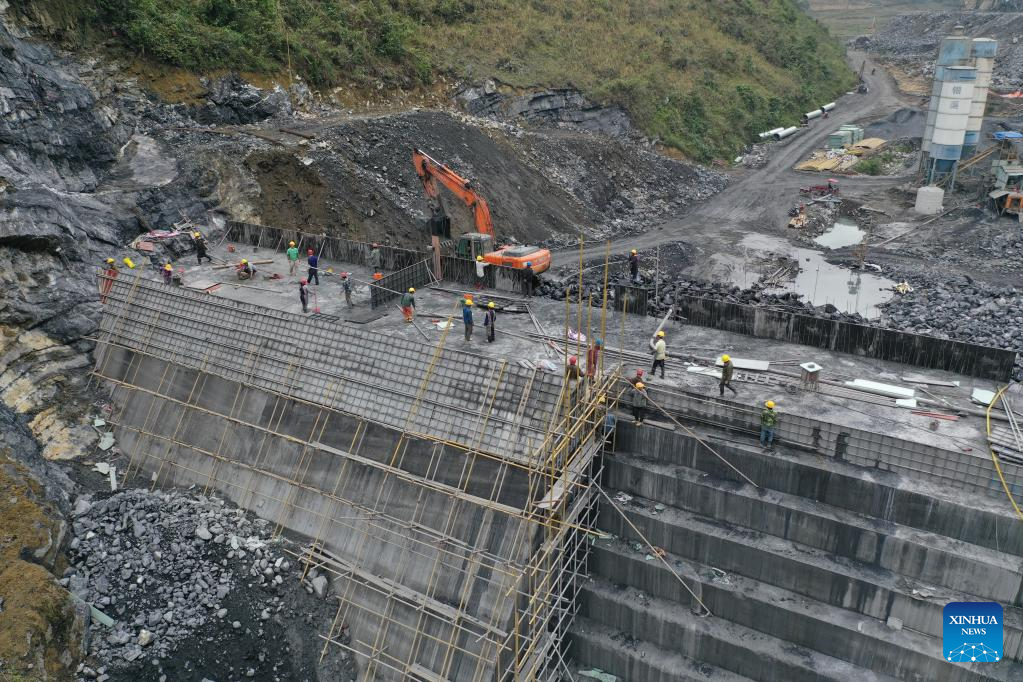 This aerial photo taken on March 20, 2023 shows Hongshui River, the water source of the drought resisting emergency water supply project in Bahao Village in Bansheng Township, Dahua Yao Autonomous County, south China's Guangxi Zhuang Autonomous Region. (Xinhua/Huang Xiaobang)