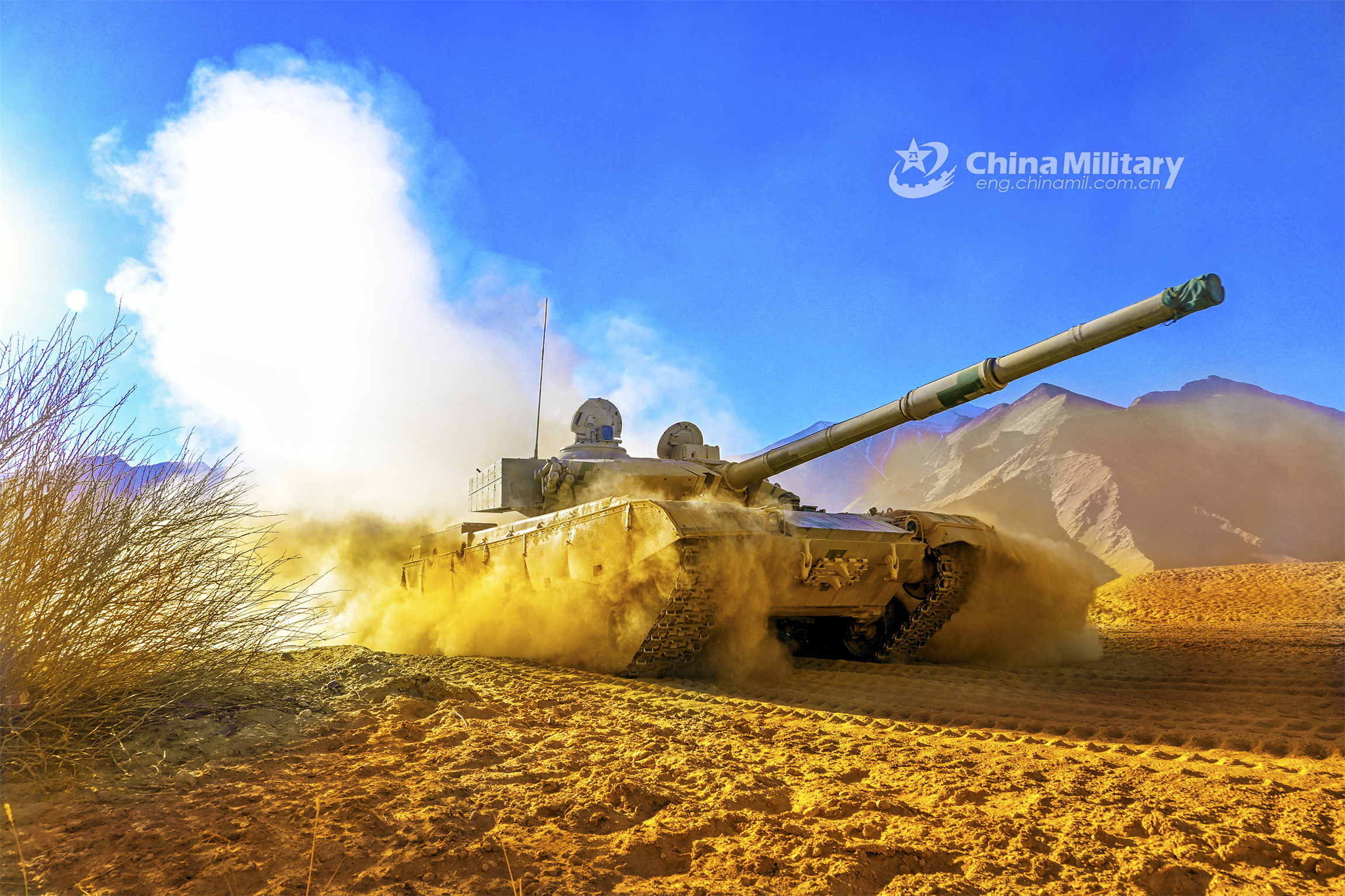 A main battle tank attached to a tank element under the PLA 77th Group Army rumbles through a mound of dust en route to a designated field during a field training exercise in northwest China's Gobi desert in mid March, 2023. (eng.chinamil.com.cn/Photo by Xue Zongyan and Liu Shanlin)