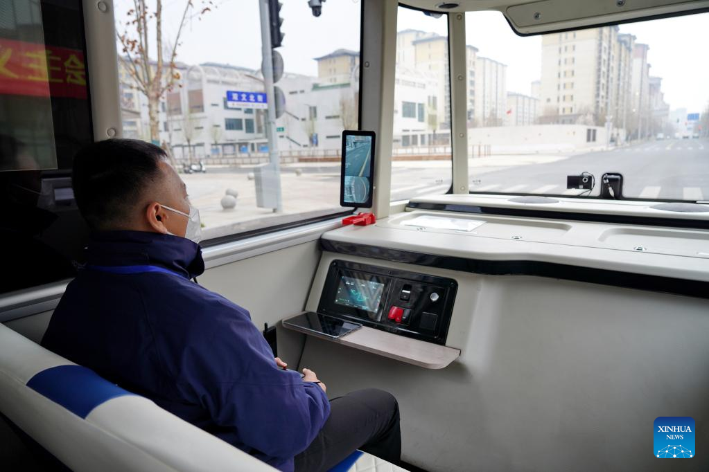 A safety officer is pictured inside an intelligent connected bus in a trial operation on a street in Rongdong area of Xiong'an New Area, north China's Hebei Province, March 20, 2023. This self-driving passenger bus is equipped with high-precision sensors including laser radars, millimeter-wave radars, and HD cameras, and capable of making operational decisions in one tenth seconds. It can also cope with adverse weather conditions and complicate traffic situations. (Xinhua/Mu Yu)