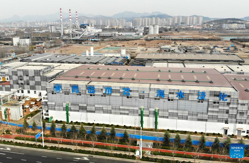 This aerial photo taken on March 20, 2023 shows a view of a seawater desalination plant in Qingdao, east China's Shandong Province. (Xinhua/Li Ziheng)