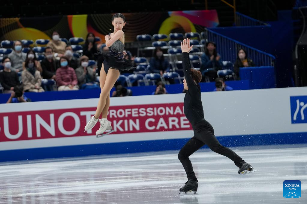 Zhang Siyang (top)/Yang Yongchao of China perform during the pairs short program at the ISU World Figure Skating Championships held at Saitama Super Area in Saitama, Japan, March 22, 2023. (Xinhua/Zhang Xiaoyu)