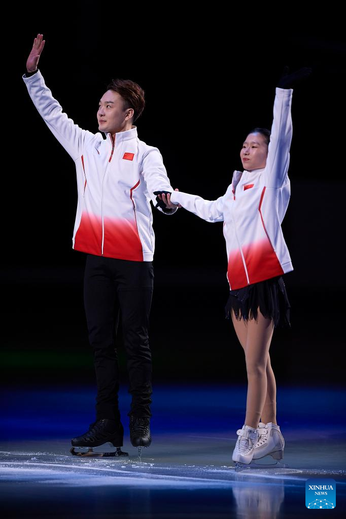 Zhang Siyang (R)/Yang Yongchao of China waves to the spectators before the pairs short program at the ISU World Figure Skating Championships held at Saitama Super Area in Saitama, Japan, March 22, 2023. (Photo by Pablo Morano/Xinhua)