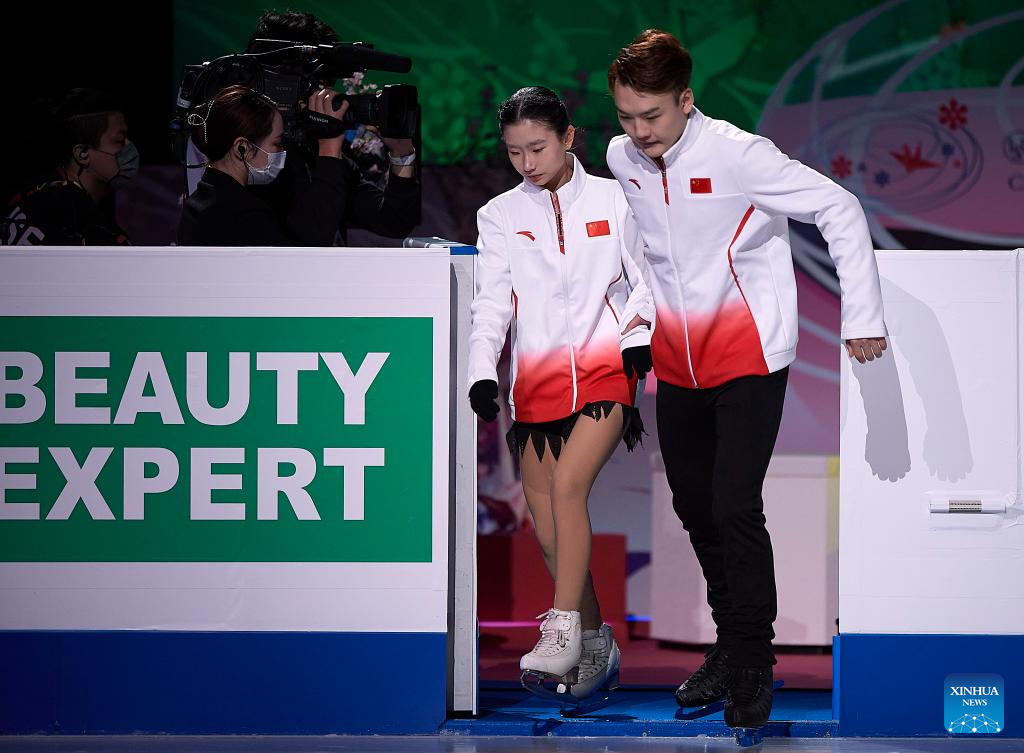 Zhang Siyang (L)/Yang Yongchao of China get on the ice rink before the pairs short program at the ISU World Figure Skating Championships held at Saitama Super Area in Saitama, Japan, March 22, 2023. (Photo by Pablo Morano/Xinhua)