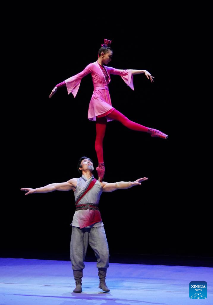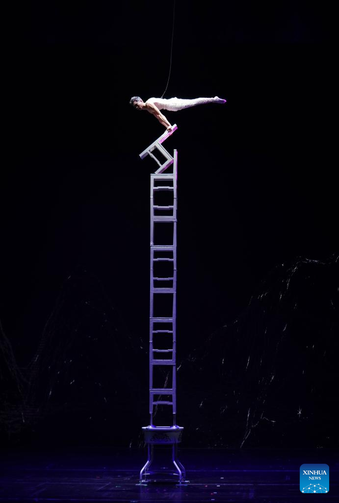 Actors perform on stage at the Shandong Grand Theatre in Jinan, east China's Shandong Province, March 21, 2023. The 11th China Acrobatic Exhibition is held on March 16-29 in Jinan. This year's event features a series of acrobatic and magic shows as well as acrobatic dramas. (Xinhua/Xu Suhui)