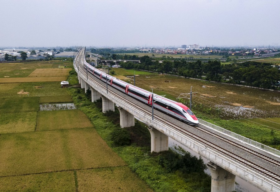 Aerial photo taken on Nov. 9, 2022 shows a test run on the Jakarta-Bandung High-Speed Railway trial section in Bandung, Indonesia. The railway is a flagship project that synergizes the China-proposed Belt and Road Initiative and Indonesia's Global Maritime Fulcrum strategy. (Xinhua/Jiao Hongtao)