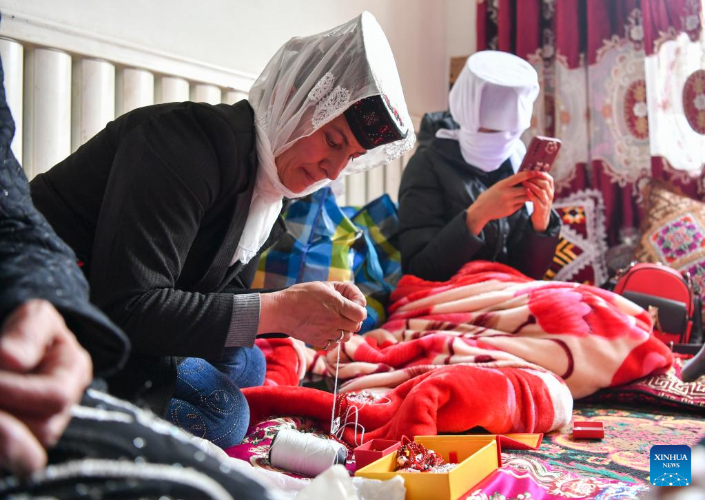 Elders of Gulihan Jrbli's family prepare her accessories for the wedding ceremony in Taxkorgan Tajik Autonomous County, northwest China's Xinjiang Uygur Autonomous Region, March 18, 2023. (Xinhua/Hu Huhu)