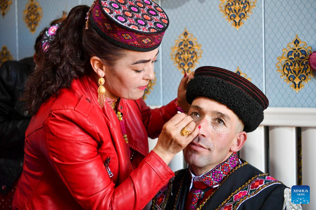 A relative applies makeup around the eyes of the groom Mairmaitih Tirmur before the wedding in Taxkorgan Tajik Autonomous County, northwest China's Xinjiang Uygur Autonomous Region, March 19, 2023. (Xinhua/Hu Huhu)