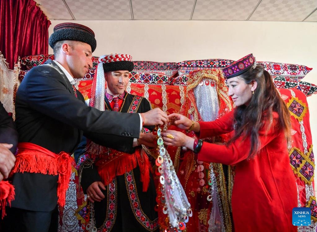 Relatives and friends (1st L and 1st R) help the bride and groom exchange rings with traditional decorations in Taxkorgan Tajik Autonomous County, northwest China's Xinjiang Uygur Autonomous Region, March 19, 2023. (Xinhua/Hu Huhu)