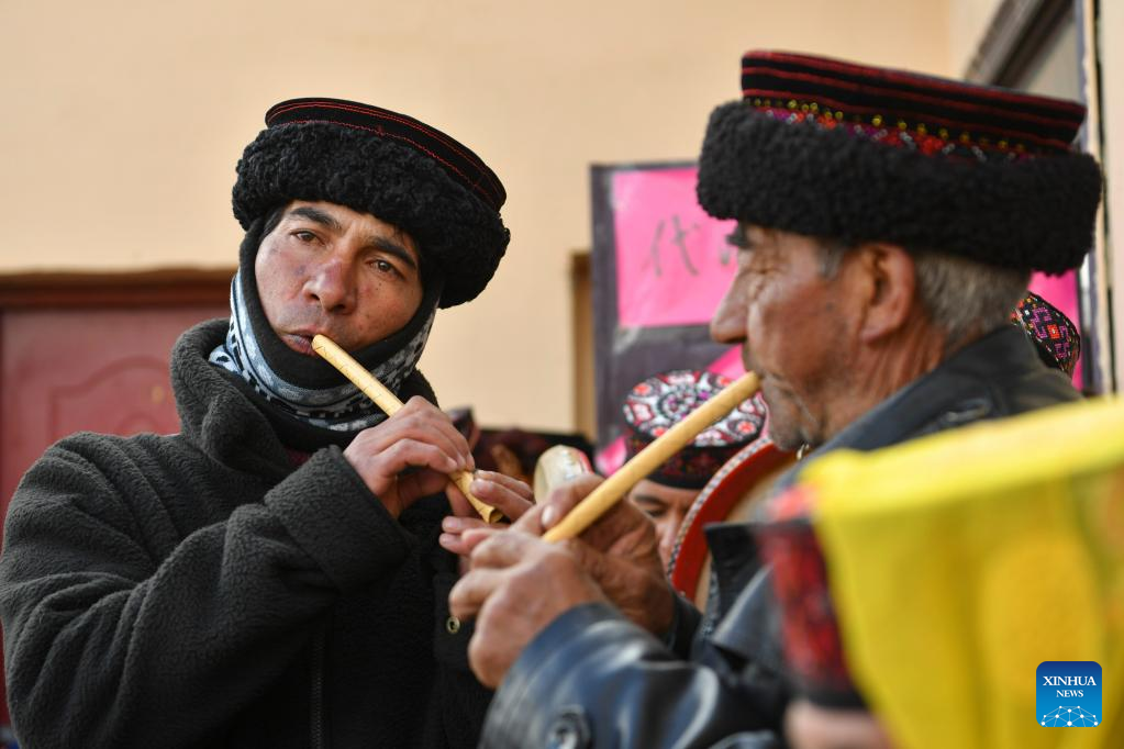 Relatives of Gulihan Jrbli play music instruments in front of the bride's home in Taxkorgan Tajik Autonomous County, northwest China's Xinjiang Uygur Autonomous Region, March 18, 2023. (Xinhua/Hu Huhu)