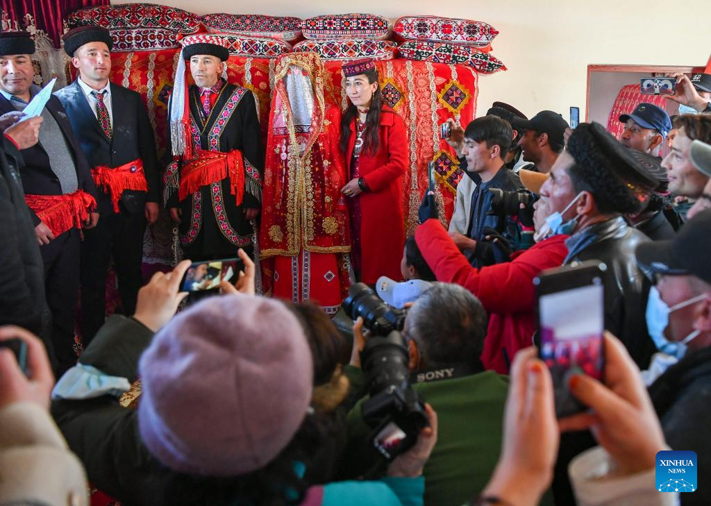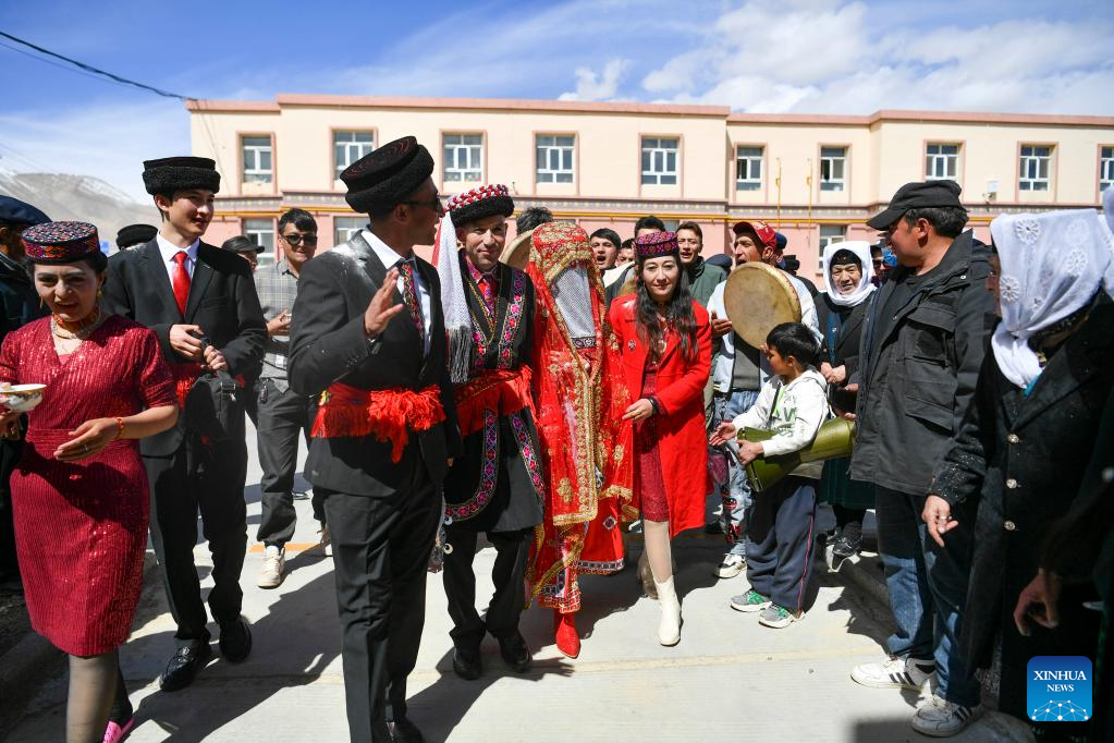 The new couple (3rd and 4th L) receive blessings at their wedding ceremony, while relatives and friends, villagers and tourists witness the happy moment in Taxkorgan Tajik Autonomous County, northwest China's Xinjiang Uygur Autonomous Region, March 19, 2023. (Xinhua/Hu Huhu)