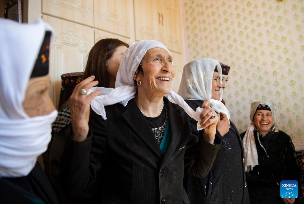 Groom Mairmaitih Tirmur's mother and relatives are pictured at the couple's new home in Taxkorgan Tajik Autonomous County, northwest China's Xinjiang Uygur Autonomous Region, March 20, 2023. (Xinhua/Hu Huhu)