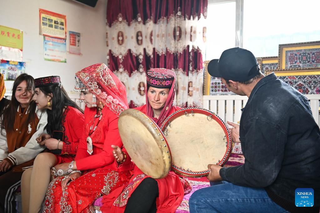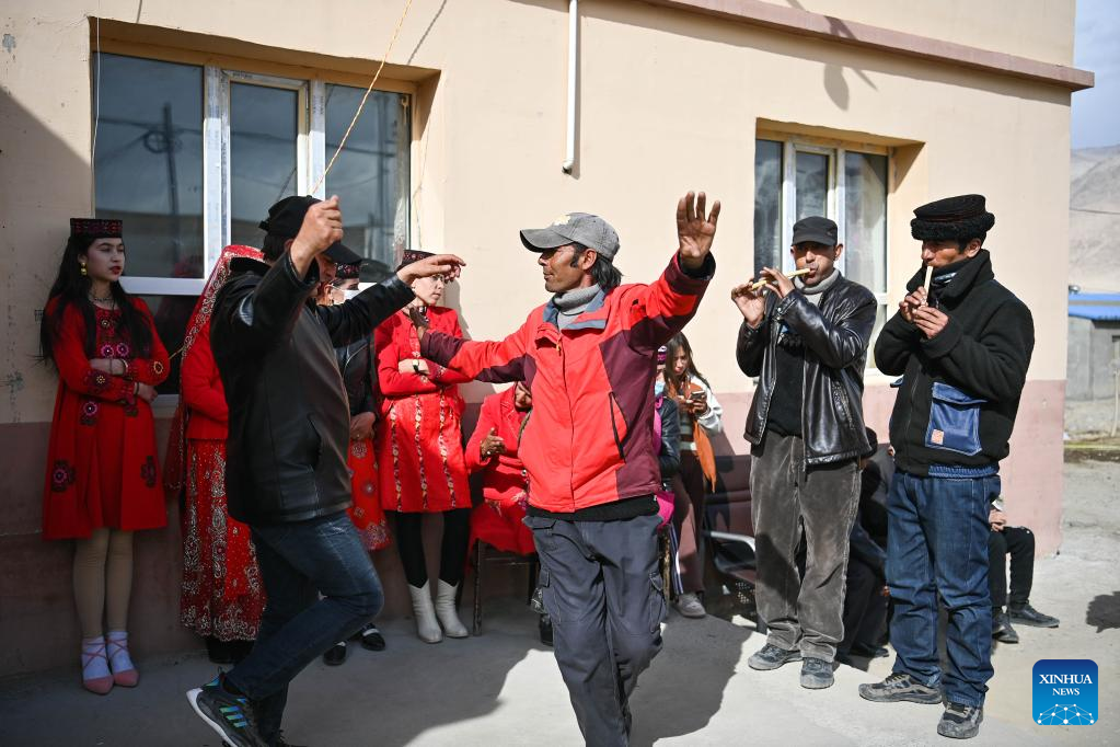 Relatives of Gulihan Jrbli play music instruments and dance in front of the bride's home in Taxkorgan Tajik Autonomous County, northwest China's Xinjiang Uygur Autonomous Region, March 18, 2023. (Xinhua/Li Xiang)