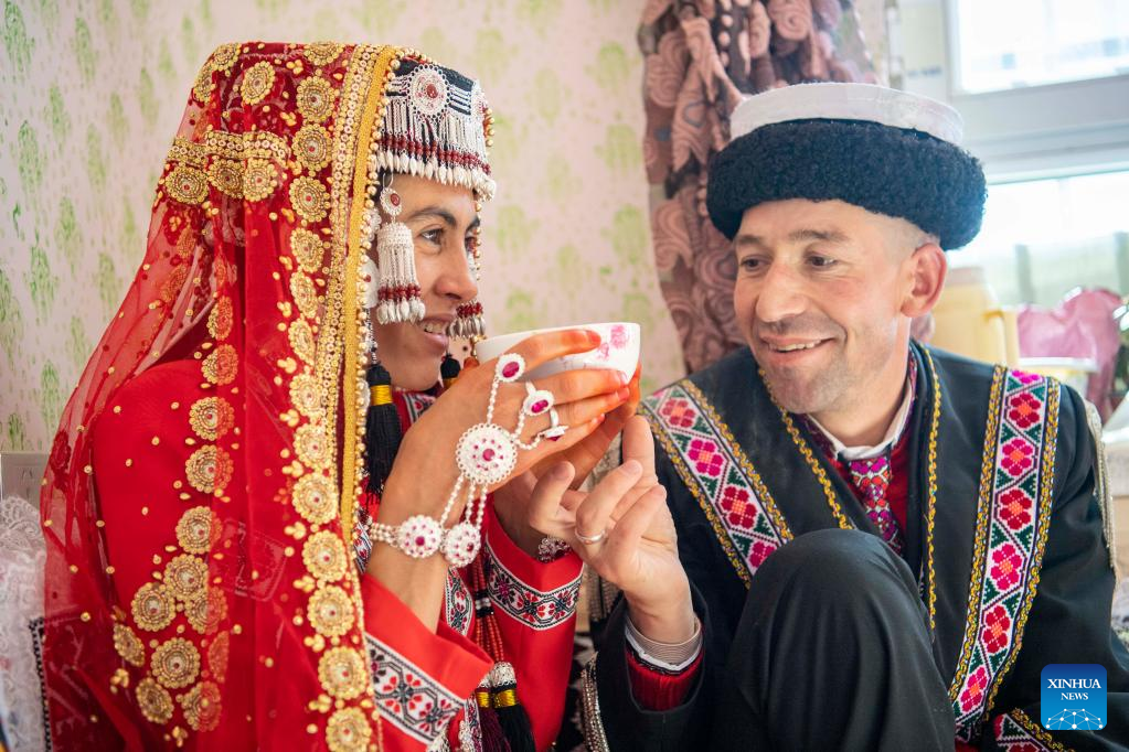 Mairmaitih Tirmur brings his bride Gulihan Jrbli a bowl of milk tea at their new home in Taxkorgan Tajik Autonomous County, northwest China's Xinjiang Uygur Autonomous Region, March 20, 2023. (Xinhua/Hu Huhu)