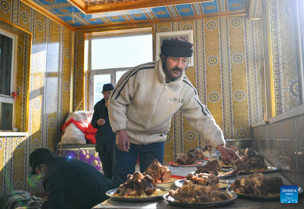 An elder of Mairmaitih Tirmur's family prepares food for relatives and friends at home in Taxkorgan Tajik Autonomous County, northwest China's Xinjiang Uygur Autonomous Region, March 19, 2023. (Xinhua/Hu Huhu)