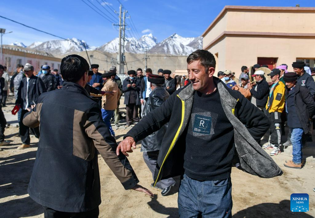 Relatives greet each other with a typical Tajik gesture -- grasping each others' hands and kissing the others' knuckles, in front of bride Gulihan Jrbli's home in Taxkorgan Tajik Autonomous County, northwest China's Xinjiang Uygur Autonomous Region, March 18, 2023. (Xinhua/Hu Huhu)