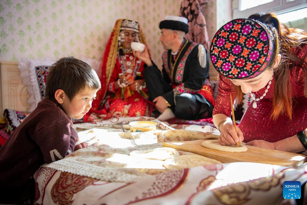 Groom Mairmaitih Tirmur's sister makes naan bread for the newlywed couple as a blessing in Taxkorgan Tajik Autonomous County, northwest China's Xinjiang Uygur Autonomous Region, March 20, 2023. (Xinhua/Hu Huhu)
