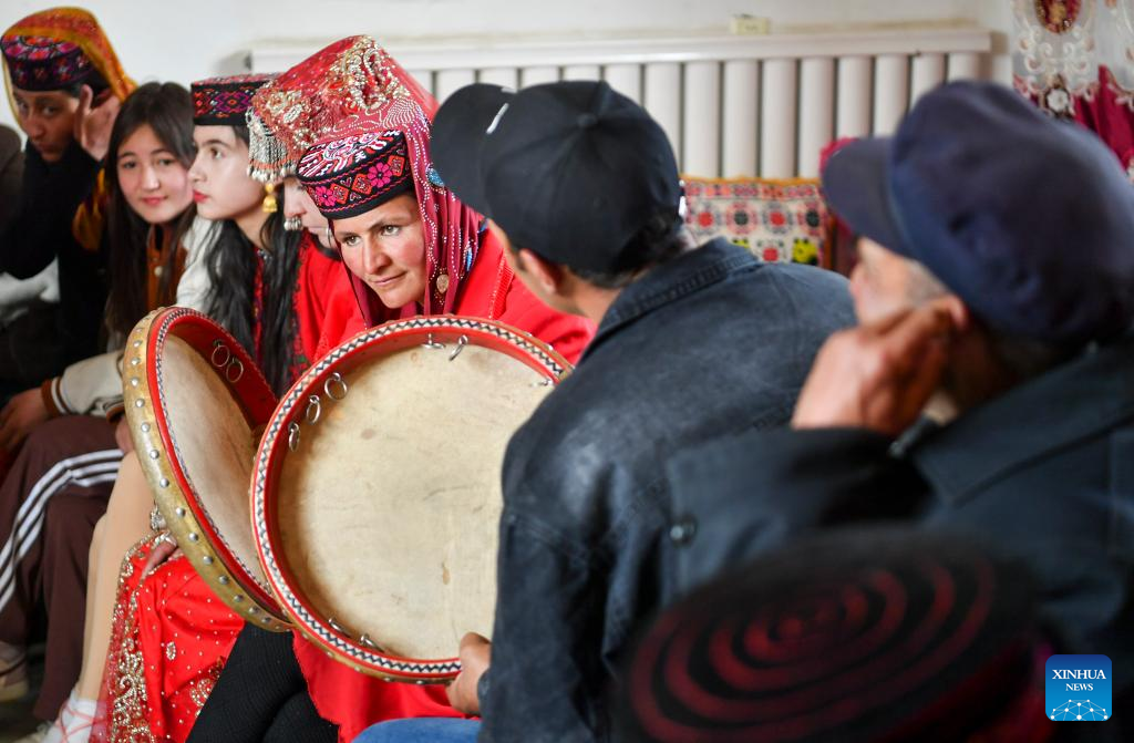 Relatives and friends of the bride Gulihan Jrbli play tambourines and sing at her home in Taxkorgan Tajik Autonomous County, northwest China's Xinjiang Uygur Autonomous Region, March 18, 2023. (Xinhua/Hu Huhu)