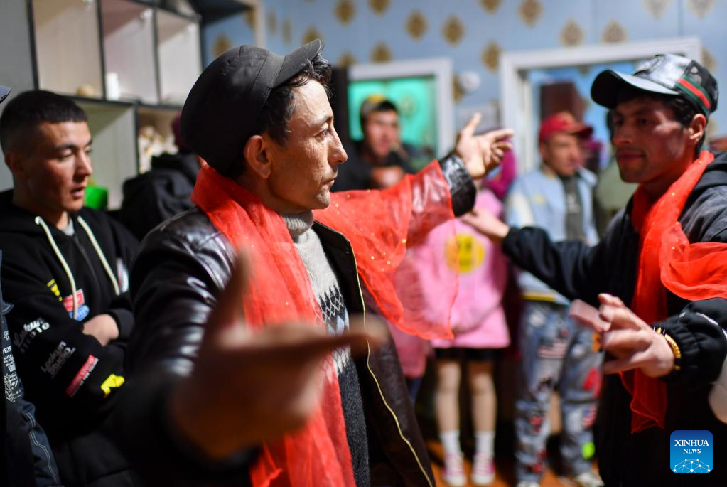 Groom Mairmaitih Tirmur's relatives dance at his home in Taxkorgan Tajik Autonomous County, northwest China's Xinjiang Uygur Autonomous Region, March 18, 2023. (Xinhua/Hu Huhu)