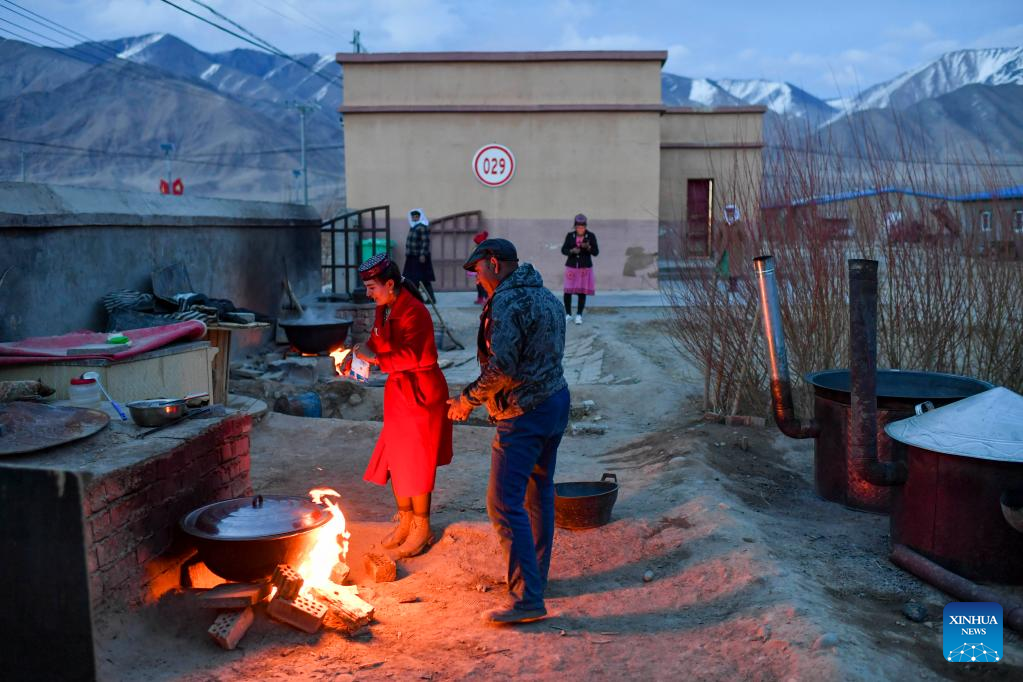 Groom Mairmaitih Tirmur's sister (L) cooks dinner for guests attending the wedding in Taxkorgan Tajik Autonomous County, northwest China's Xinjiang Uygur Autonomous Region, March 18, 2023. (Xinhua/Hu Huhu)