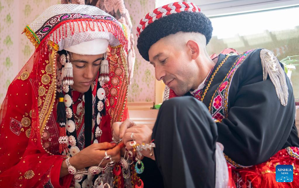 Mairmaitih Tirmur helps his bride Gulihan Jrbli arrange ornaments on her hands at their new home in Taxkorgan Tajik Autonomous County, northwest China's Xinjiang Uygur Autonomous Region, March 20, 2023. (Xinhua/Hu Huhu)