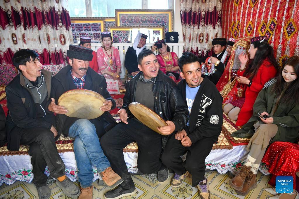 Relatives and friends sing loudly at the wedding ceremony to send blessings to the new couple in Taxkorgan Tajik Autonomous County, northwest China's Xinjiang Uygur Autonomous Region, March 19, 2023. (Xinhua/Hu Huhu)