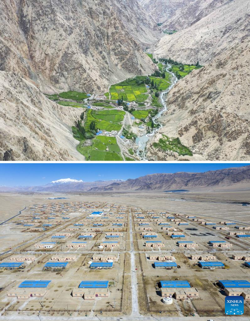 The upper part of the combo photo taken on June 28, 2019 shows an aerial view of Maryang Township, where Gulihan Jrbli and her family used to live before relocation; and the lower part of the combo photo taken on March 17, 2023 shows an aerial view of Fumin Village and Aimin Village, where Gulihan and her family live after resettlement, in Taxkorgan Tajik Autonomous County, northwest China's Xinjiang Uygur Autonomous Region. (Xinhua/Hu Huhu)