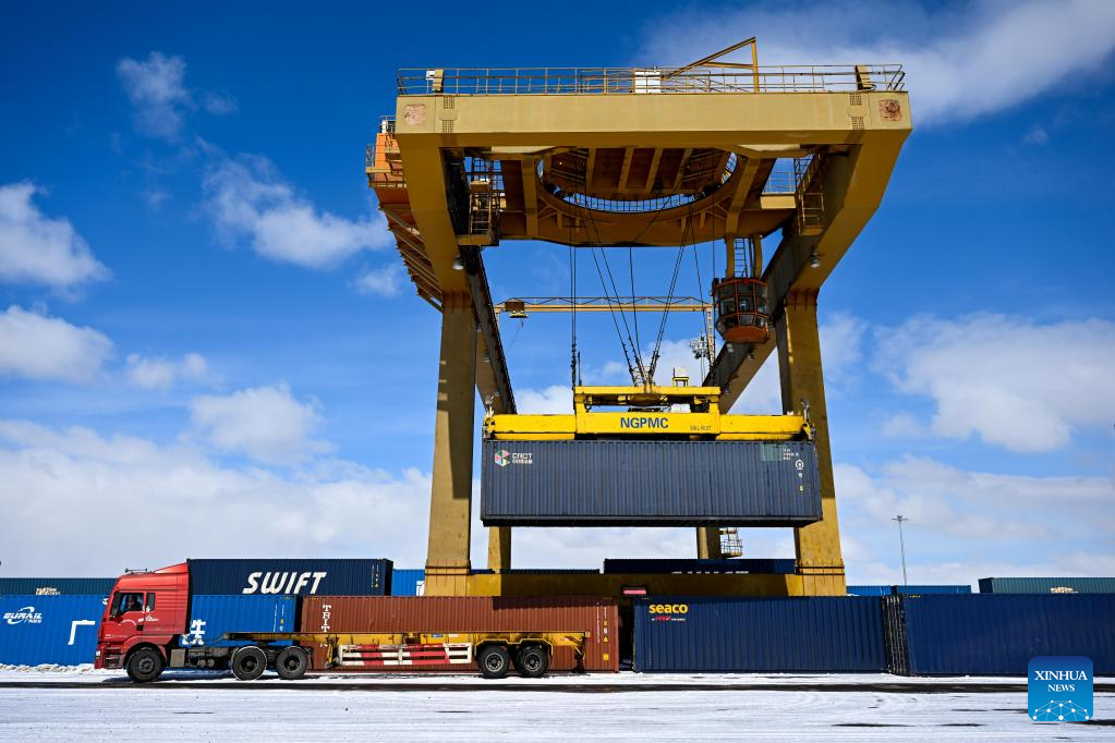 A crane loads containers at the Manzhouli Railway Station in Manzhouli, north China's Inner Mongolia Autonomous Region, March 15, 2023. (Xinhua/Bei He)
