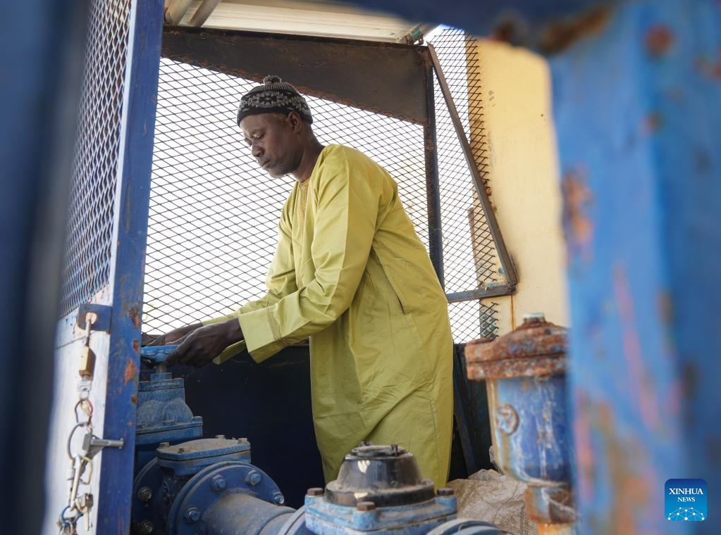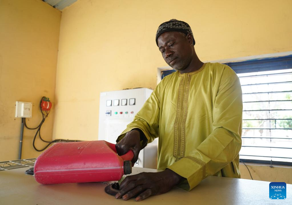 Mamadou Dieng fills the generator of a well project with diesel in Tenefoul Toucouleur Village, Diourbel, Senegal, March 20, 2023. (Xinhua/Han Xu)
