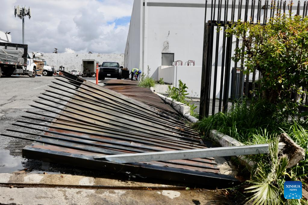 Photo taken on March 23, 2023 shows an iron fence damaged by a tornado in the city of Montebello, Los Angeles, the United States. Los Angeles area was hit by a rare tornado on Wednesday, the strongest one to impact LA Metro area since March 1983, according to the U.S. National Weather Service (NWS). (Xinhua)
