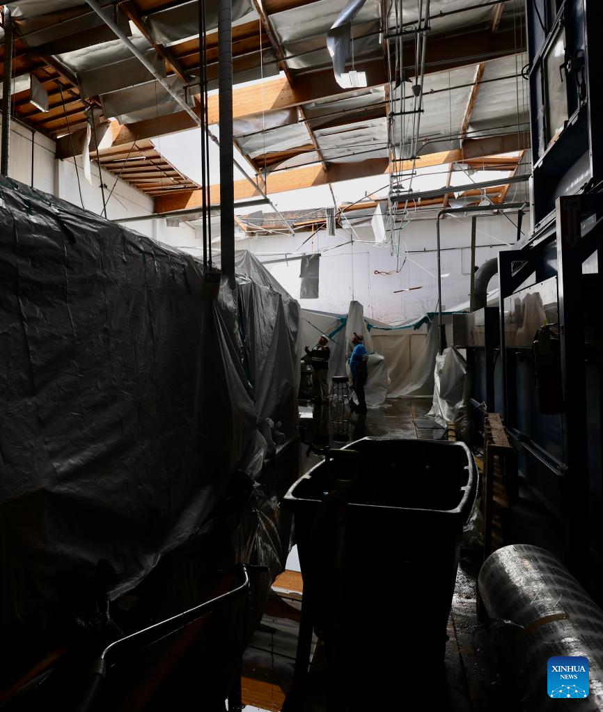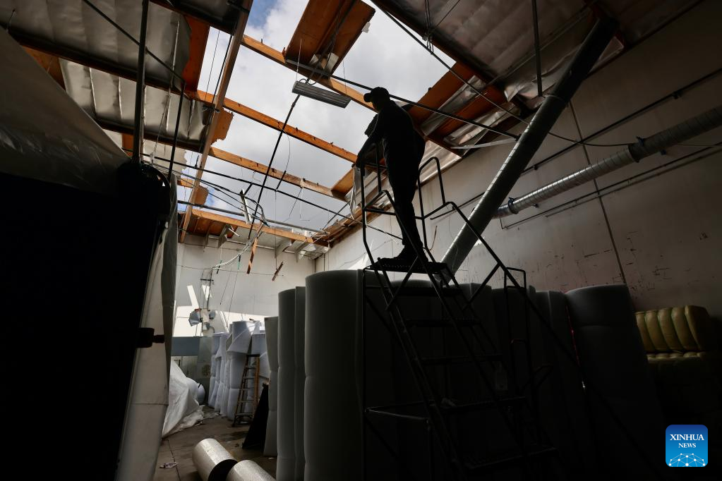 A person checks a warehouse rooftop damaged by a tornado in the city of Montebello, Los Angeles, the United States, on March 23, 2023. Los Angeles area was hit by a rare tornado on Wednesday, the strongest one to impact LA Metro area since March 1983, according to the U.S. National Weather Service (NWS). (Xinhua)