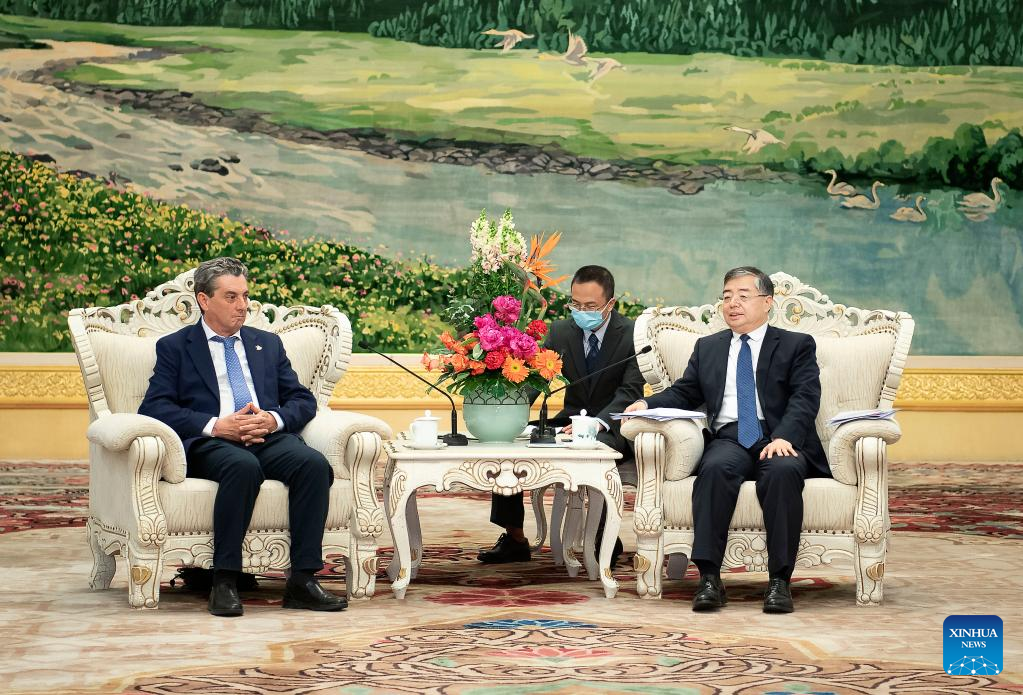 Li Shulei, a member of the Political Bureau of the Communist Party of China (CPC) Central Committee and head of the Publicity Department of the CPC Central Committee, meets with a Spanish delegation led by Jose Luis Centella, president of the Communist Party of Spain, in Beijing, capital of China, March 23, 2023. The delegation consisted of representatives of Spain's left-wing political parties, think tanks and media. (Xinhua/Li Tao)