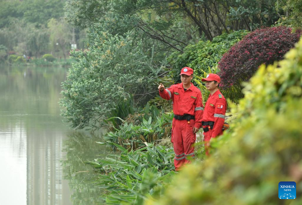 Members of an urban waterway system management team patrol the north section of Liuhua Creek in Fuzhou, southeast China's Fujian Province, March 21, 2023. (Xinhua/Lin Shanchuan)