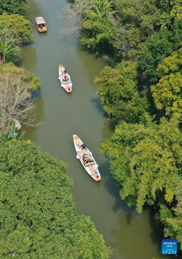 This aerial photo taken on Feb. 25, 2023 shows tourists taking a boat ride along the Baima River in Fuzhou, southeast China's Fujian Province. (Xinhua/Lin Shanchuan)