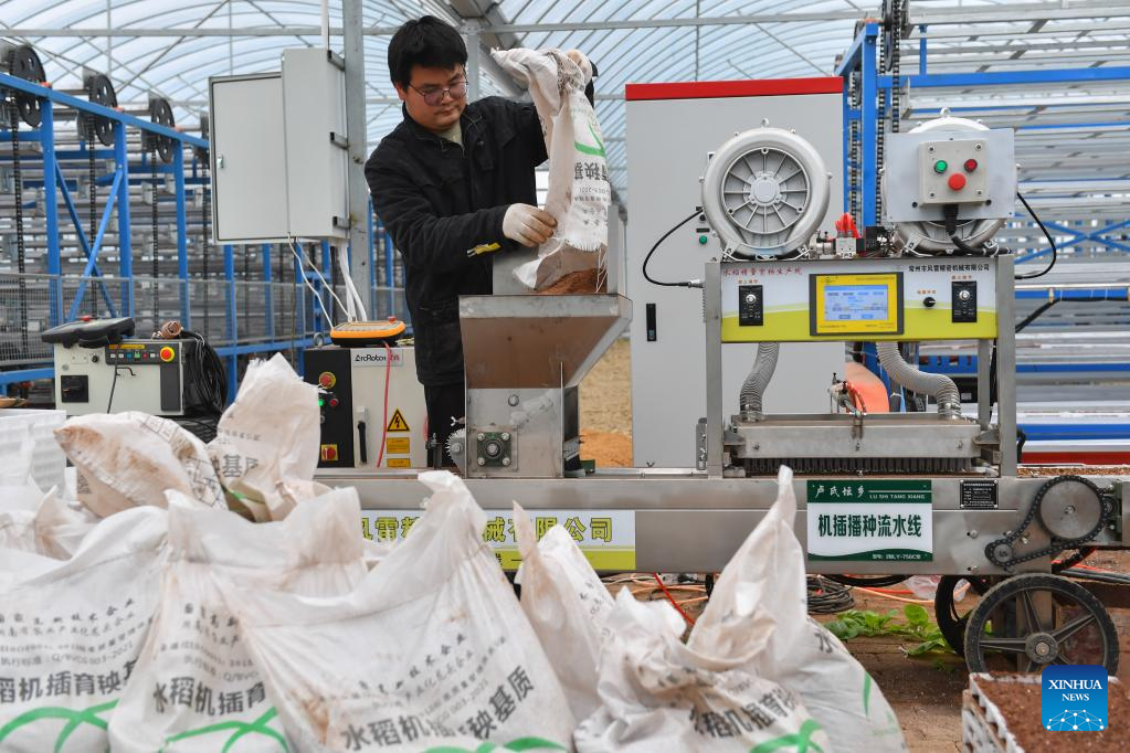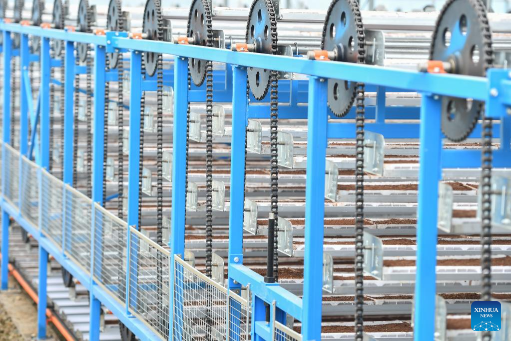 A seedling breeding machine works at a multi-functional greenhouse in Yuhu District of Xiangtan City, central China's Hunan Province, March 23, 2023. (Xinhua/Chen Zeguo)