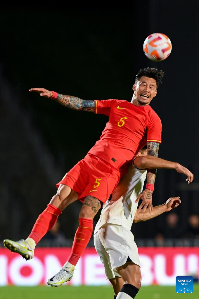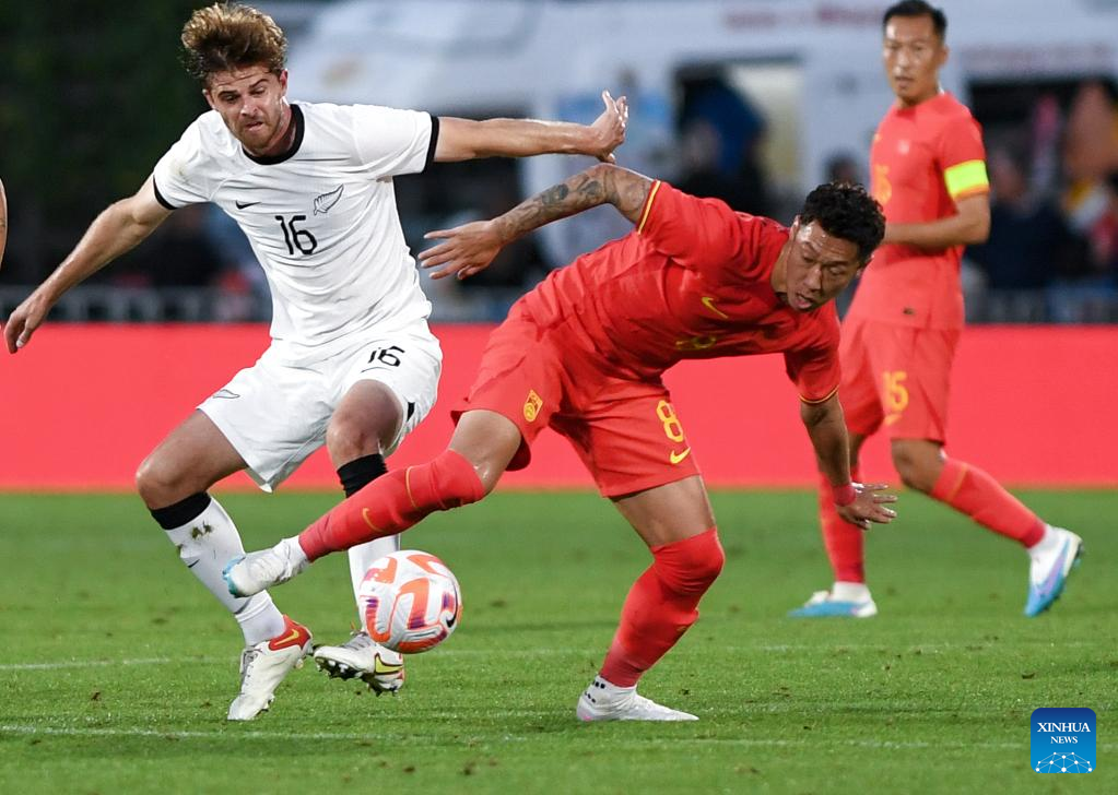 Xu Xin (L) of China vies with Alex Rufer of New Zealand during an international freindly match between New Zealand and China in Auckland, New Zealand, March 23, 2023. (Xinhua/Guo Lei)