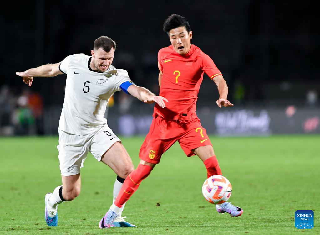 Wu Lei (L) of China controls the ball during an international freindly match between New Zealand and China in Auckland, New Zealand, March 23, 2023. (Xinhua/Guo Lei)