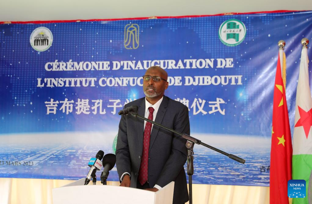 Minister of National Education and Vocational Training of Djibouti Moustapha Mohamed Mahamoud speaks at the inauguration ceremony of Confucius Institute in Djibouti City, Djibouti, on March 23, 2023. The Confucius Institute in Djibouti was inaugurated Thursday, with the stakeholders pledging to make the institute a better platform for China-Djibouti cooperation. (Xinhua/Wang Ping)