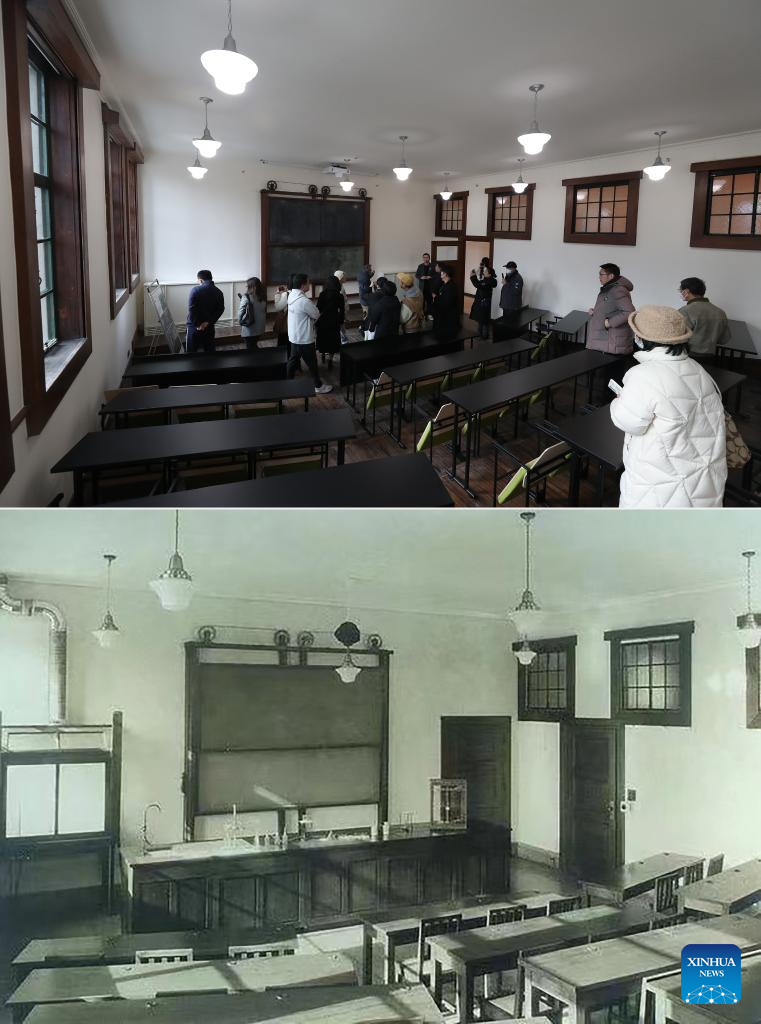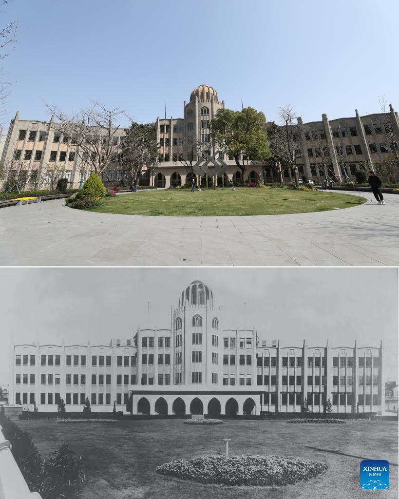 This combo photo shows the site of Henry Lester Institute of Technical Education, a heritage building which is now home to the Design Innovation Institute Shanghai, on March 16, 2023 (above, taken by Fang Zhe) and an undated file photo of the same place in east China's Shanghai. (Xinhua/Fang Zhe)